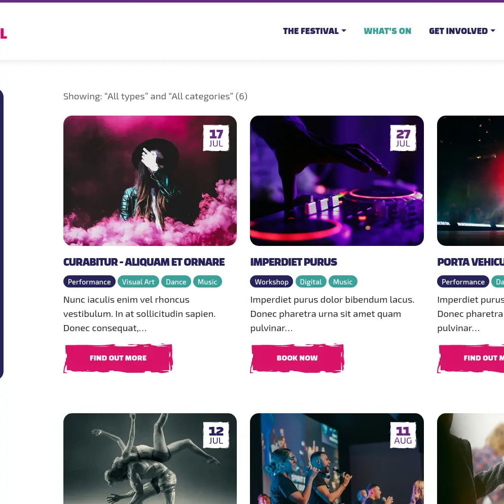 Of course, the main focus of this project centers around the events. (Referred to as "What's on" in menus.) Events can have their own detail pages, but some of them will link directly to the EventBrite booking page.