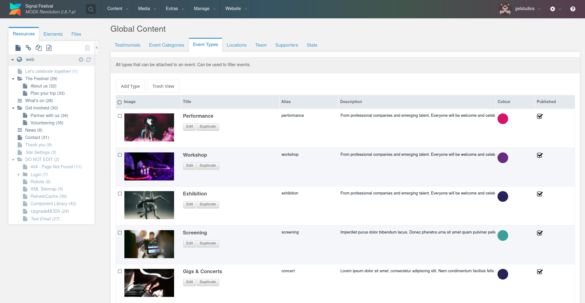 Some types of content are going to be reused on different pages. To avoid having to add them again on each page, these items live under a Global Content section. Accessible via Top Menu > Content > Global.