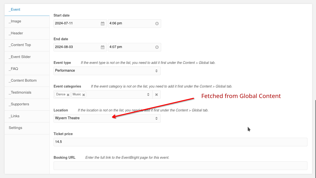 Locations are Global Content, and each Event has a selector for choosing a location.